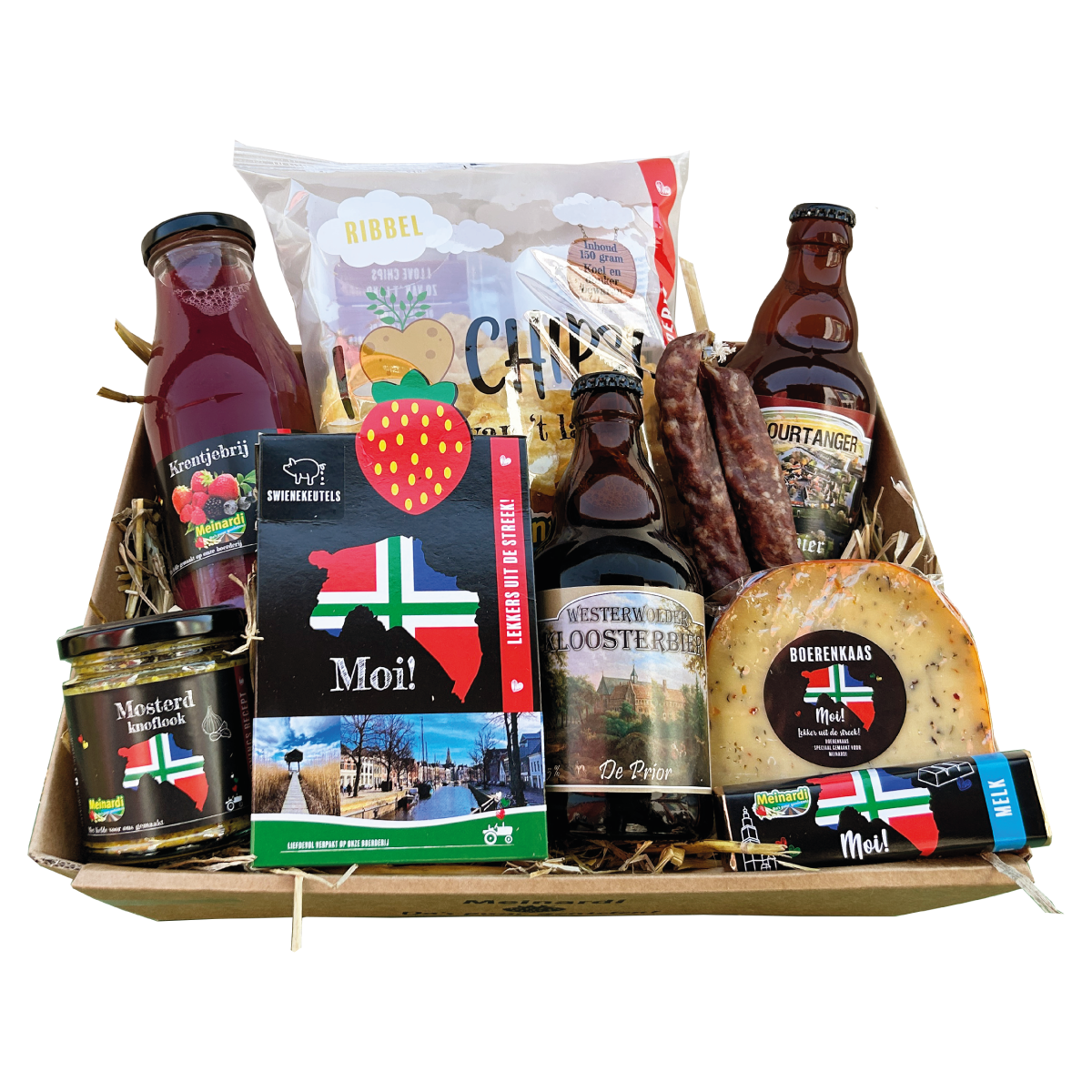 Verras iemand met Groninger lekkernijen! Huisgemaakte krentjebrij, echte Groninger worst, biertjes uit de streek… Veur de echte Grunneger!